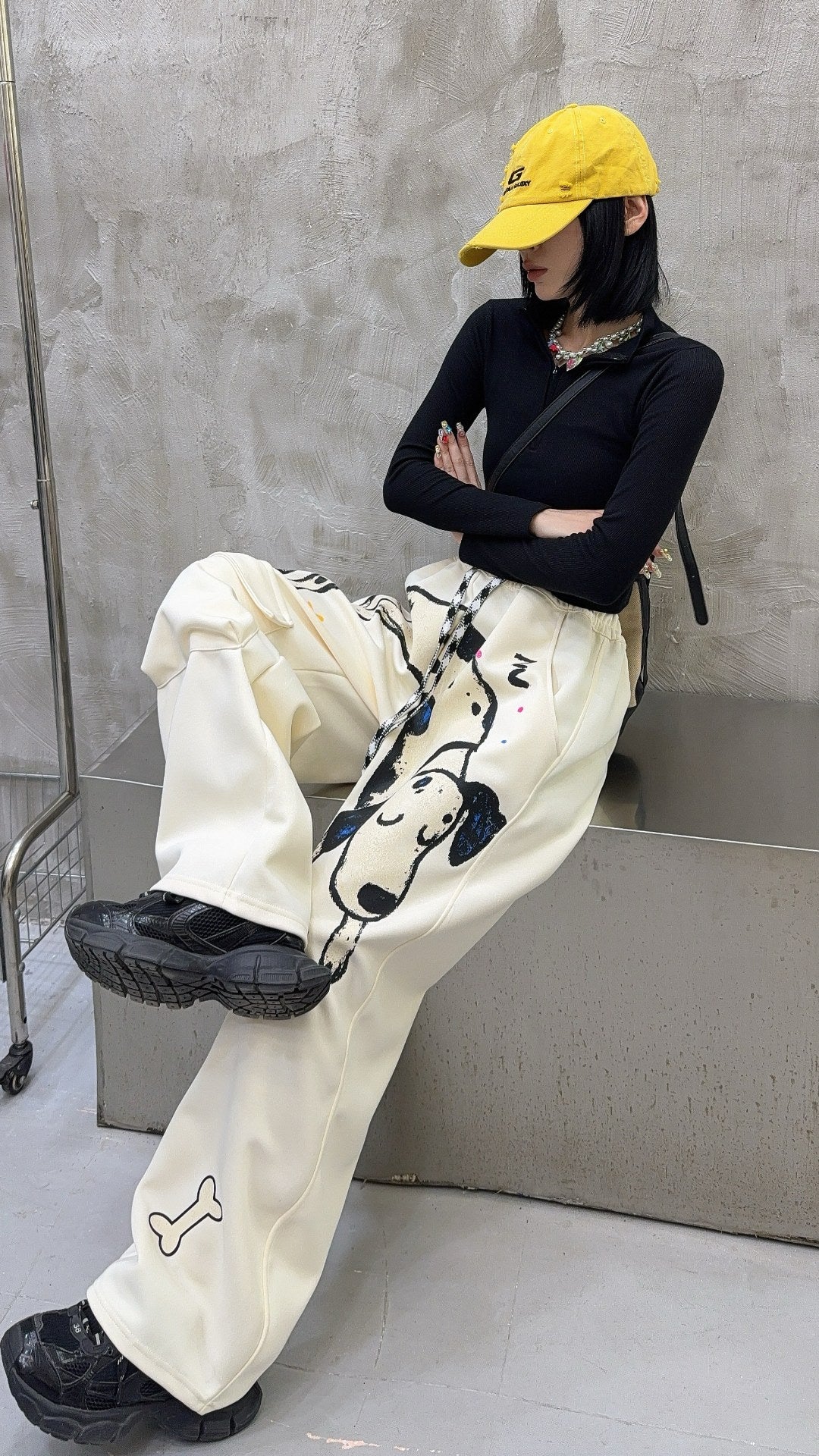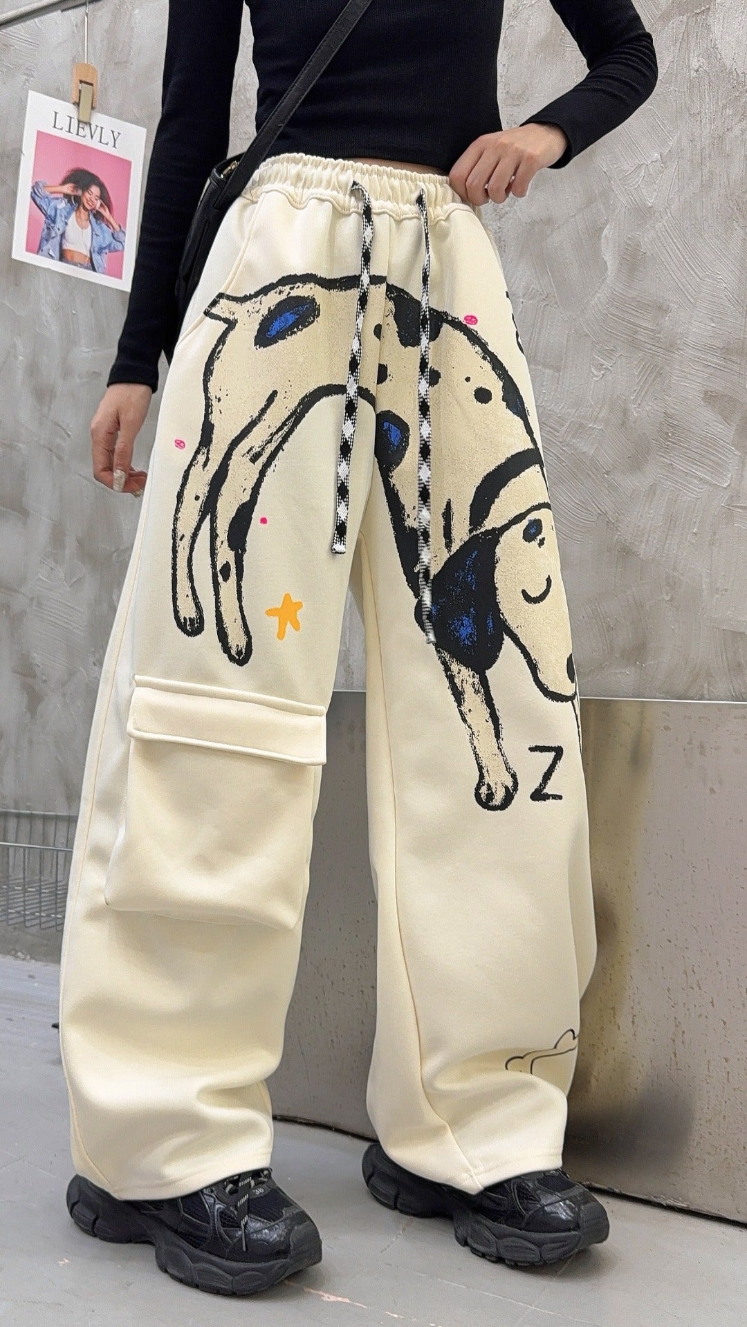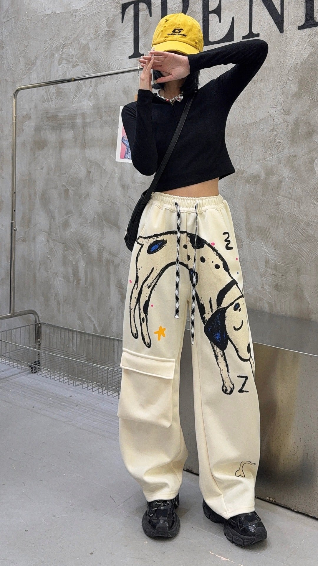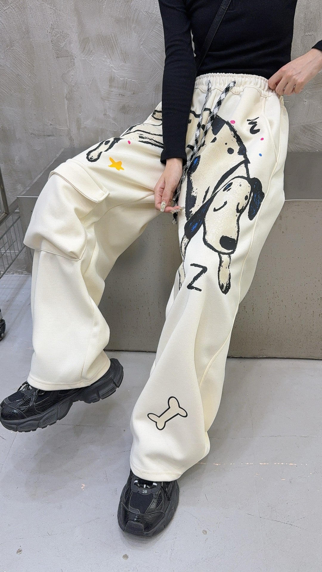 🄶🅁🄾🅄🄽🄳♾🅉🄴🅁🄾25-26SS♾無性別穿搭OverSize美式新款塗鴉狗狗寬口長褲(現貨優惠)